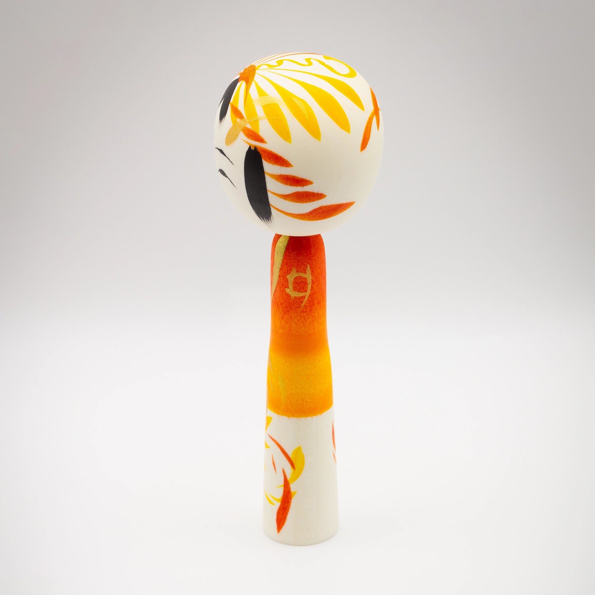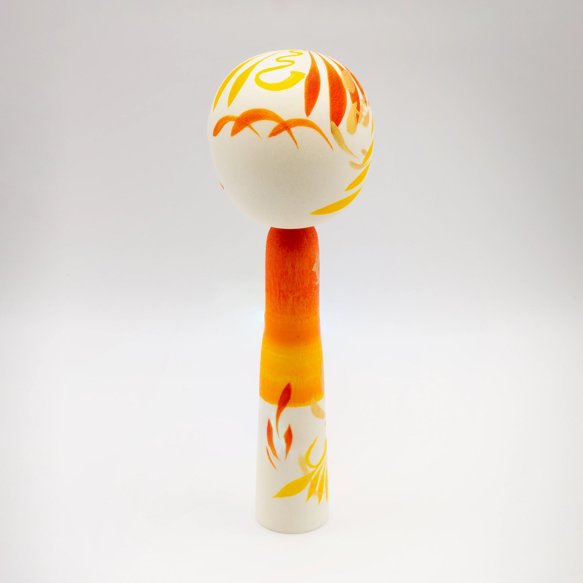 This hand-crafted Kokeshi doll is a unique example of traditional Japanese woodcraft, thoughtfully reinterpreted in a contemporary form by artist Noboru Wagatsuma. Turned and painted by hand, each piece is truly one of a kind. The figure features a delicate floral pattern inspired by classic Kokeshi motifs, paired with a warm orange-yellow colour palette that gives the surface depth, vibrancy, and a gentle sense of modern elegance.