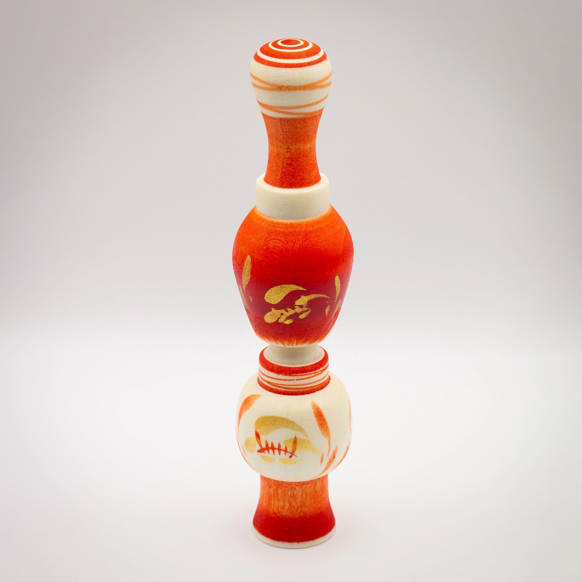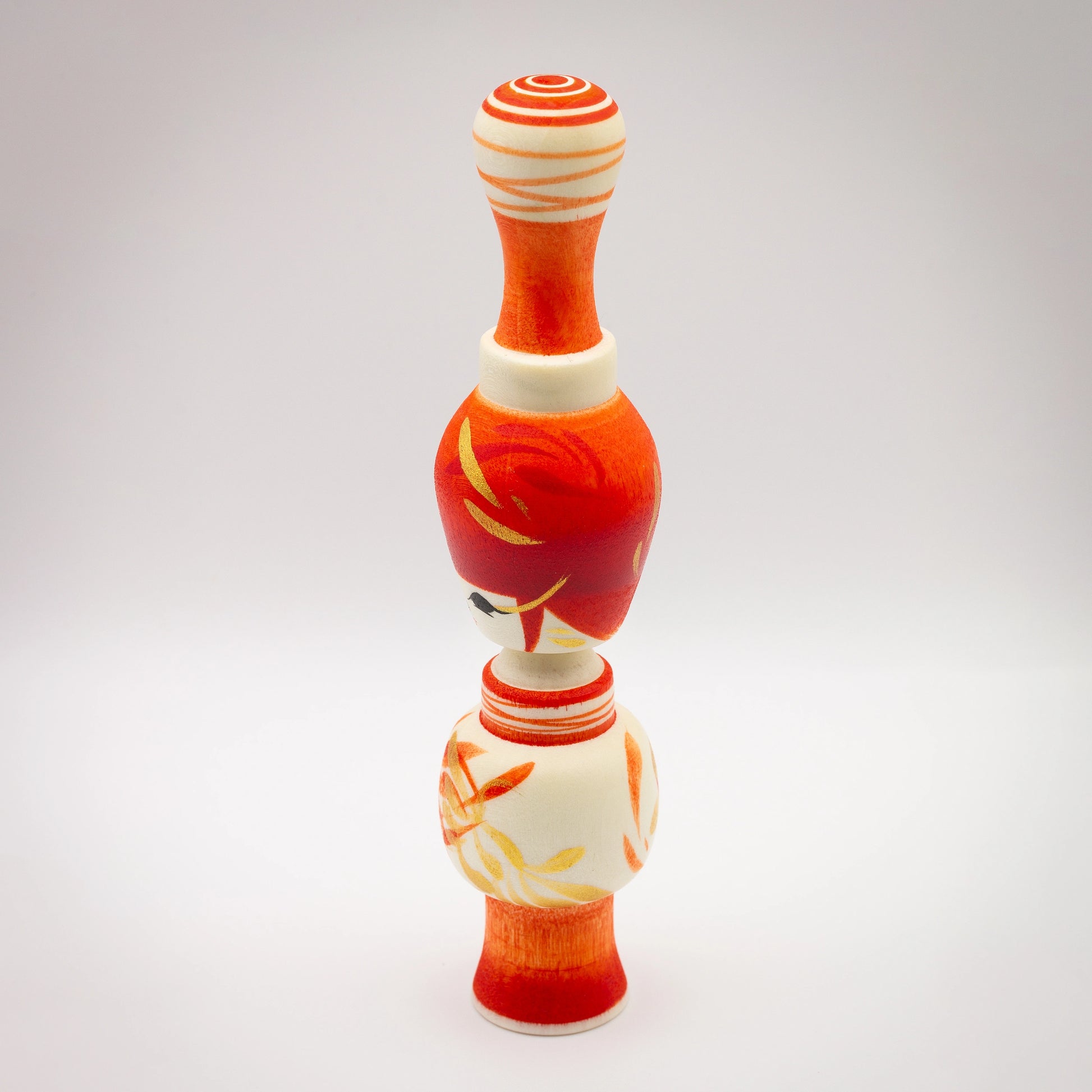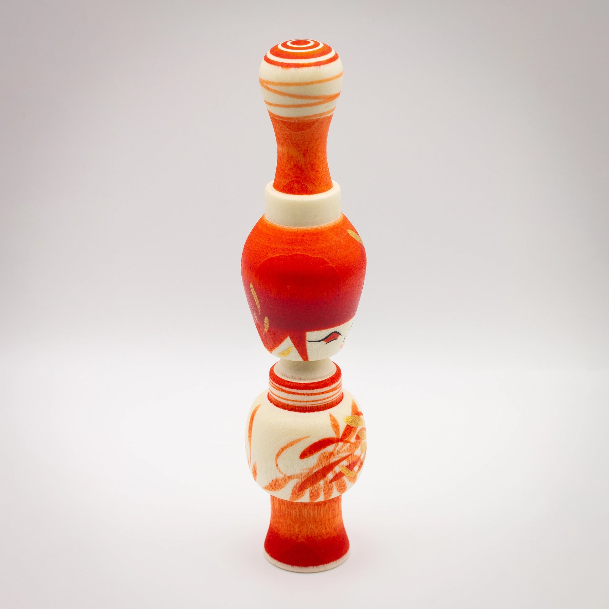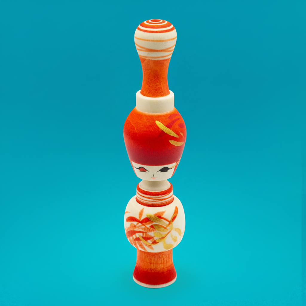 This handcrafted Kokeshi by artist Noboru Wagatsuma impresses with its luminous warm colouring and exceptionally fine painting that reinterprets traditional Japanese motifs in contemporary elegance. The distinctive topknot hairstyle gives the figure a characterful, expressive presence and elevates it beyond the classic Kokeshi tradition.