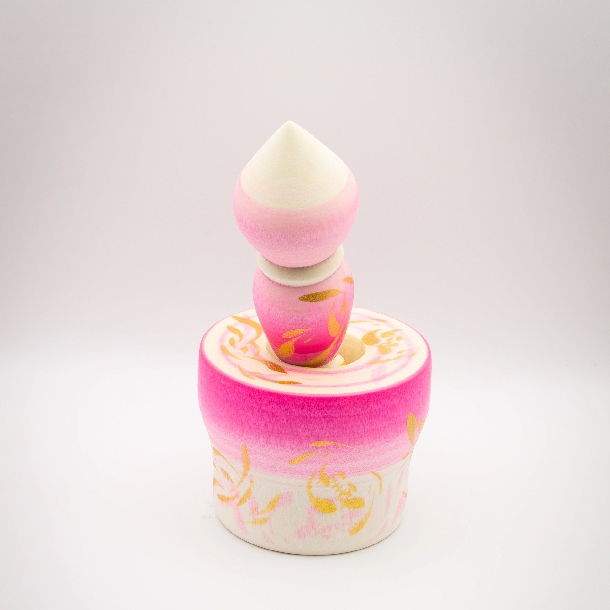 The soft pink colour palette combined with finely executed floral patterns creates a delicate, feminine atmosphere and emphasises the symbolic meaning of care and security. Wagatsuma masterfully succeeds in merging classic Kokeshi motifs with contemporary design language—the clean, minimalist silhouette allows the delicate hand-painting and charming facial features to truly shine.