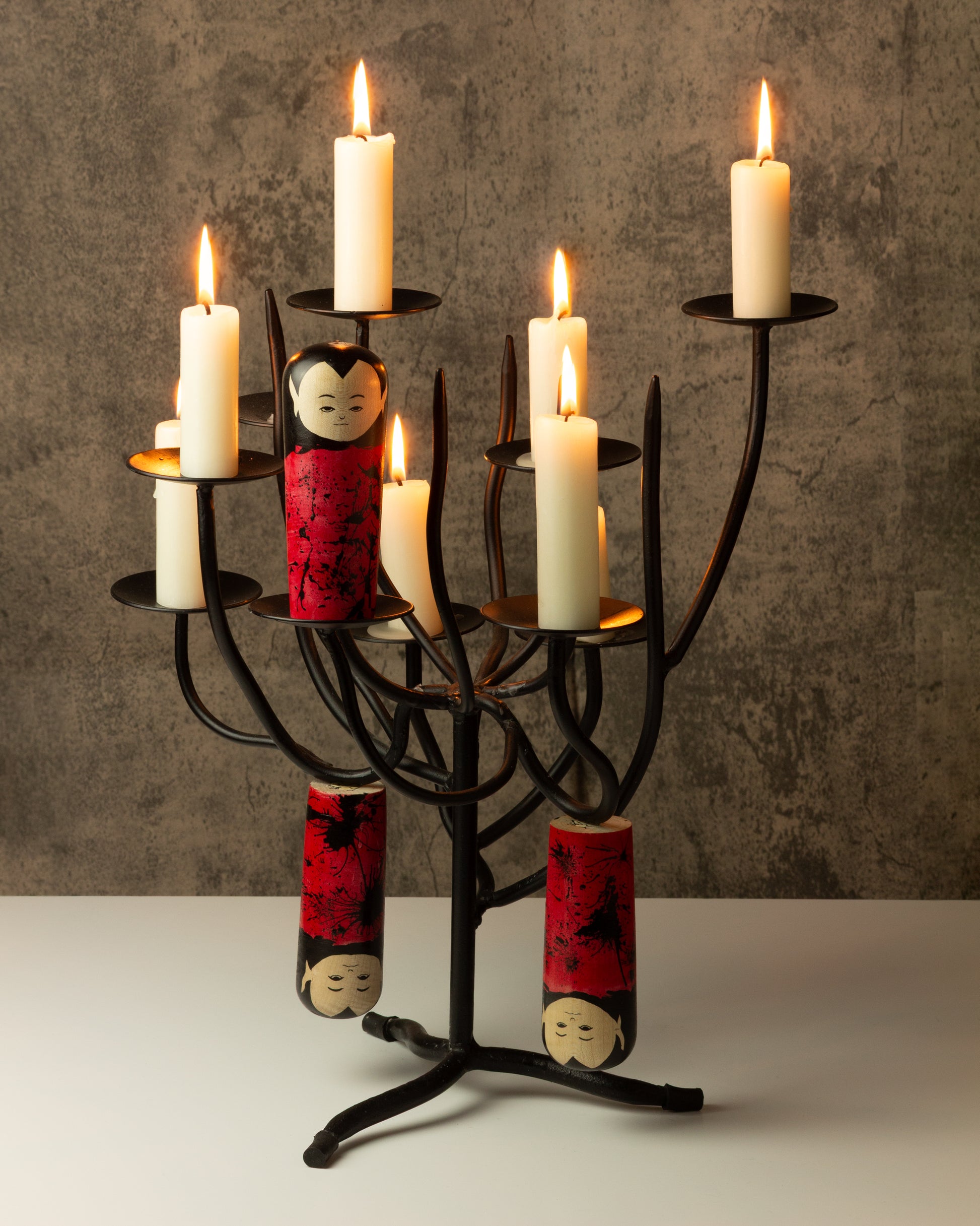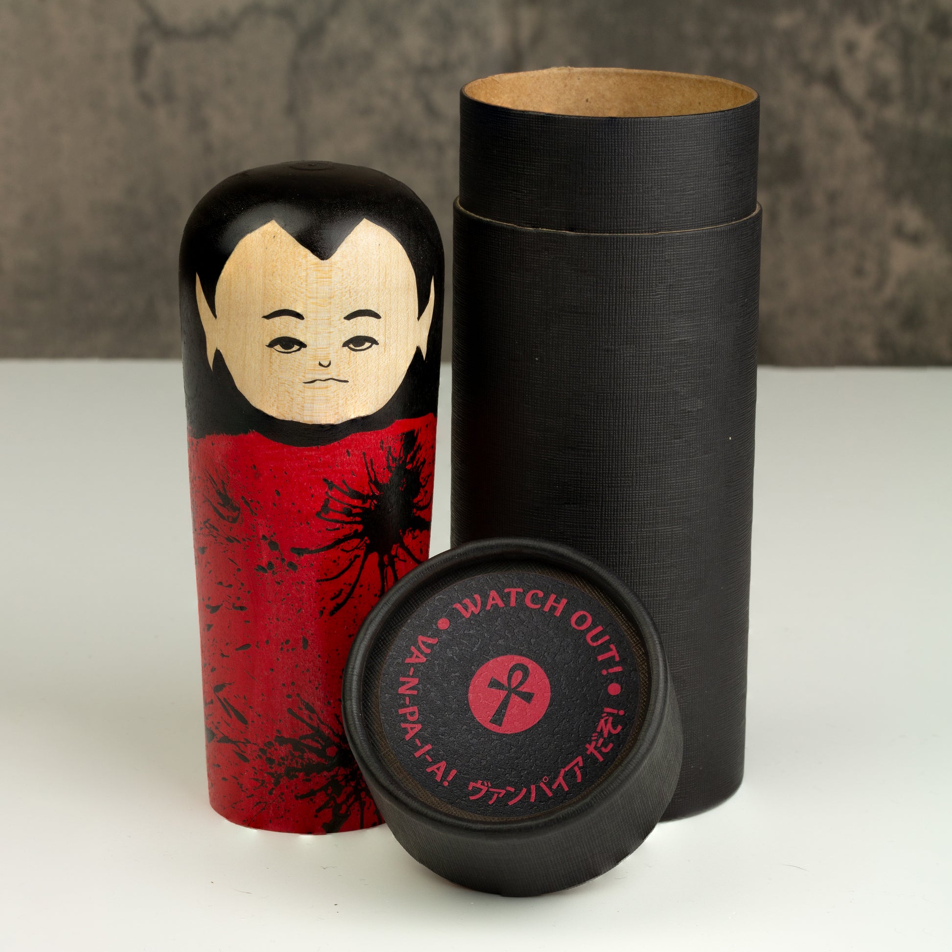 A special feature: a magnet is embedded in the figure, allowing the Kokeshi to be hung upside down — just as a true vampire would! Whether on a metal surface or a decorative hook, when displayed upside down it reveals its full charm and becomes a floating centrepiece in any room.