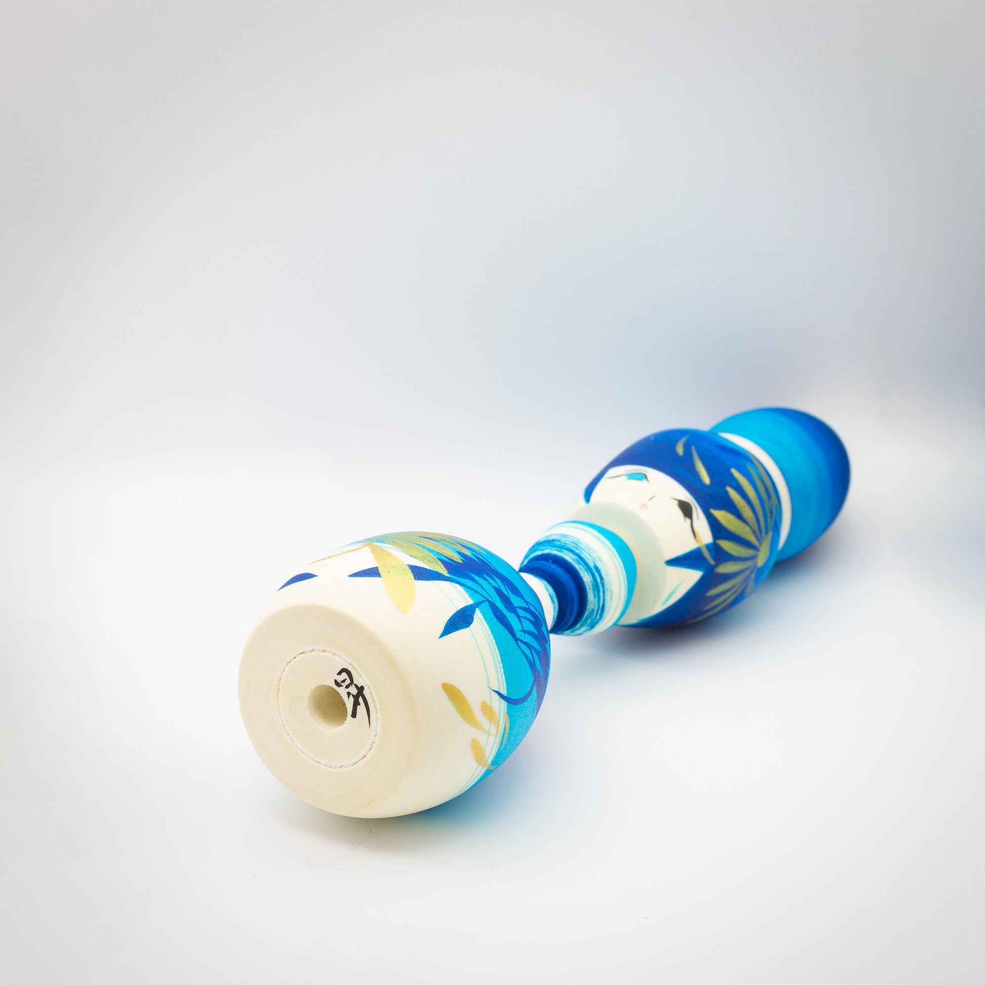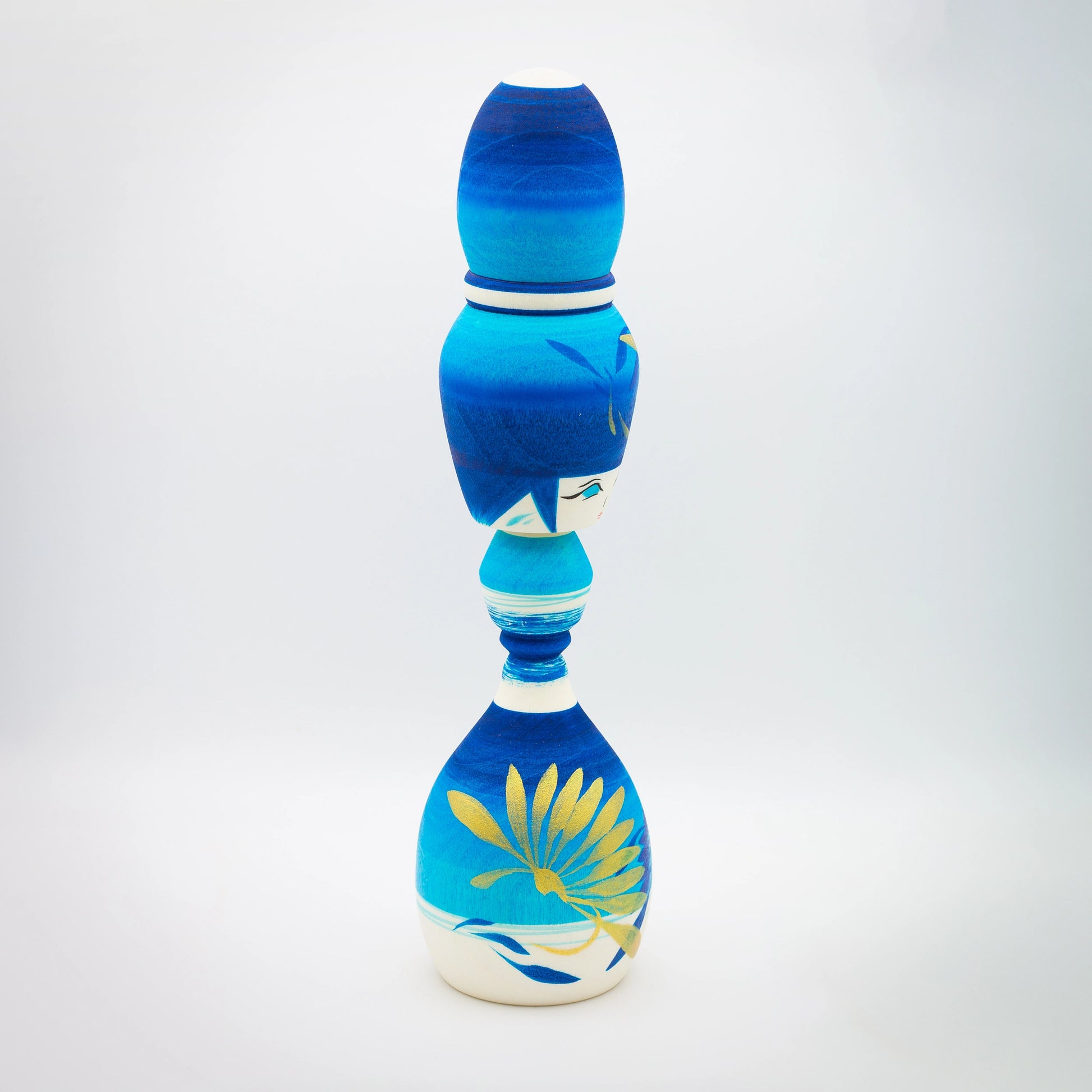 Diese beeindruckende Kokeshi von Künstler Noboru Wagatsuma besticht durch ihre leuchtende azurblaue Farbgebung, die der handgedrechselten Figur eine besondere Tiefe und Ausdruckskraft verleiht. Mit ihrer stattlichen Größe und der markanten Dutt-Frisur entwickelt diese Kokeshi eine kraftvolle Präsenz, die traditionelle japanische Handwerkskunst mit moderner Farbästhetik auf harmonische Weise vereint.